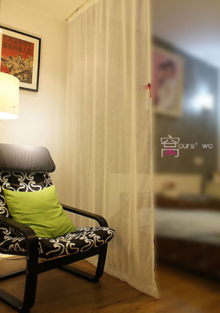 由于空間不是很大,在客廳和臥室之間,用了白色飄紗,把兩個(gè)空間隔開,淺淺的,可以從臥
