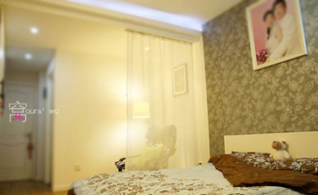 飄紗的選用,既不占用空間,也起了有效的分割空間作用,隱隱約約的,有一點(diǎn)點(diǎn)朦朧的感覺,臥室墻上采用了比較暗色調(diào)的墻紙,看,還有俺倆的婚紗照,是不是很浪漫呢?