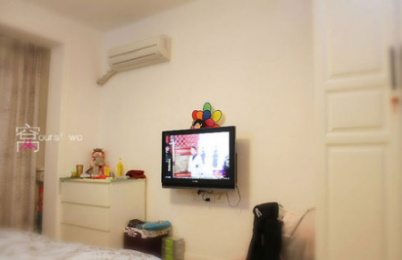 由于小的緣故,只能把客廳擺放的物件,擺放到臥室里。精致的小型液晶電視,白色的漆墻,簡單而不簡陋。