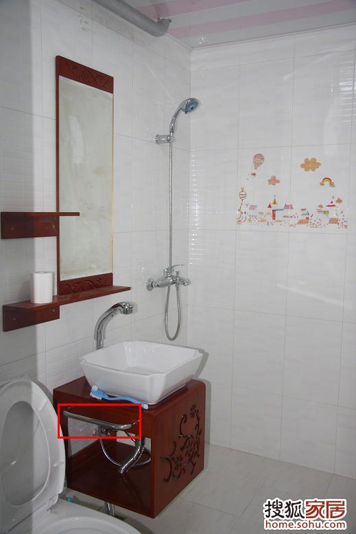 再放大一點(diǎn)。本來(lái)這個(gè)掛件是安在另一邊的,后來(lái)我發(fā)現(xiàn)從門口看柜子,下面都是管子,太亂了,所以,當(dāng)場(chǎng)叫師傅給改在靠門這邊了,將來(lái)掛上毛巾,就OK啦。