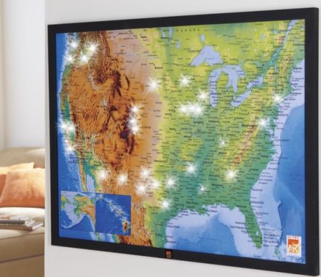 這款大型的地圖帶有8種顏色共100個(gè)LED小燈,方便您地圖上將您去過(guò)的城市和景點(diǎn)做標(biāo)記。此外還有兩個(gè)可以閃耀的小燈是專門為標(biāo)記您的“故鄉(xiāng)”使用的。這款地圖精致美觀,放在家中或是辦公室里都是不錯(cuò)的選擇。