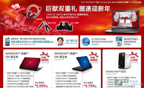 從12月27日到1月6日,戴爾推出了“巨獻(xiàn)雙重禮 提速迎新年”的促銷:多款酷睿筆記本的處理器升級,并且還送山水2.1音箱以及筆記本支架。其中,戴爾Studio 15z筆記本升級到了i5-480M處理器,升級之后還降價500元,目前的售價為7499元;戴爾靈越13R(Ins13RD-448)筆記本升級到了i3-380M處理器、500GB硬盤,升級之后價格還是4999元;戴爾靈越13R(Ins13RD-438)筆記本升級到了奔騰雙核P6200處理器,升級之后價格還降到了4399元。