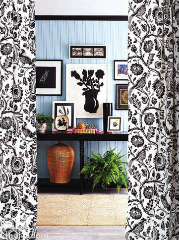 顏色純粹、孔雀藤蔓圖案的印花布簾充當(dāng)落地屏風(fēng),把門廳與客廳分隔開,不同形式的黑白組合配飾將色調(diào)主題從千篇一律中拯救出來。
