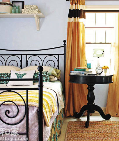 黑色是出位的色彩,黑色是摩登的象征,用在卷曲的鐵藝床頭架、圓形的床頭幾時又是那么優(yōu)雅。不知從何處著手?有膽量的話就把窗戶框格作為布置的起點(diǎn)吧。