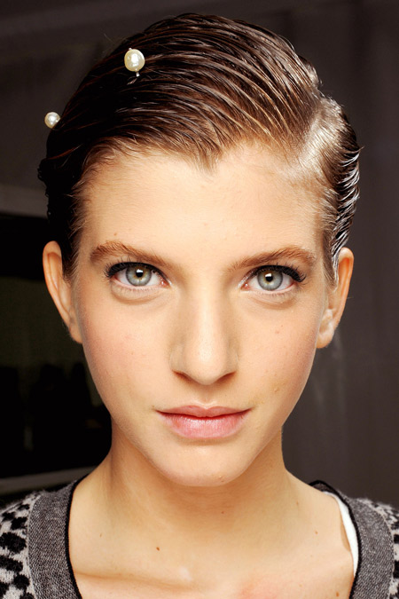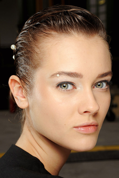 ??? 香奈兒 (Chanel) 2012春夏巴黎時(shí)裝周秀場上,彩妝師Peter Philips 把妝容重點(diǎn)放在光澤上,體現(xiàn)出唯美純凈和淡淡的奢華,與裝點(diǎn)的施華洛世奇半圓形珍珠相映生輝。他用白皙又有光澤的底妝配上了粉色珊瑚色的腮紅,濕潤并微閃光澤的眼影,最后以黑色的眼線收尾。嘴唇上也帶著微微的珠光,最亮的只有粉色唇彩和被貼在模特的眉毛、耳朵和鼻側(cè),或者濕潤的頭發(fā)上的白色珍珠。