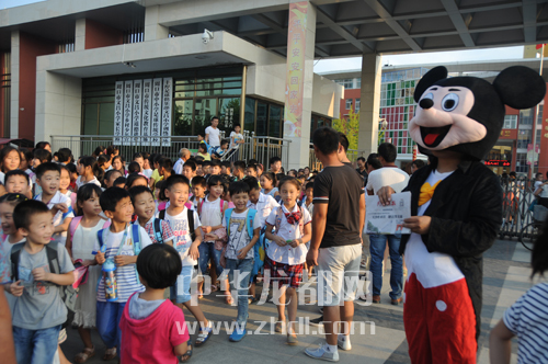 ????9月1日17時(shí)許,在慶豐路周口市文昌小學(xué)門前,家長們看到周口晚報(bào)工作人員在派發(fā)禮品,紛紛掏出手機(jī),掃描二維碼關(guān)注周口晚報(bào)微信公眾號(圖一)。17時(shí)40分,放學(xué)的孩子們排著整齊的隊(duì)伍陸續(xù)走出校門。校門外,由周口晚報(bào)記者扮演的米老鼠和唐老鴨“大玩偶”吸引了孩子們的目光(圖二)。孩子們興奮地同“大玩偶”玩耍起來。有玩的,還能免費(fèi)領(lǐng)取學(xué)習(xí)用品,孩子們大聲召喚家長加入到掃描二維碼關(guān)注周口晚報(bào)微信公眾號的“大軍”中來。市民趙先生說:“我是咱晚報(bào)的忠實(shí)讀者,正準(zhǔn)備訂閱明年的報(bào)紙,還打算讓孩子參加晚報(bào)組織的小記者活動(dòng)呢!”
