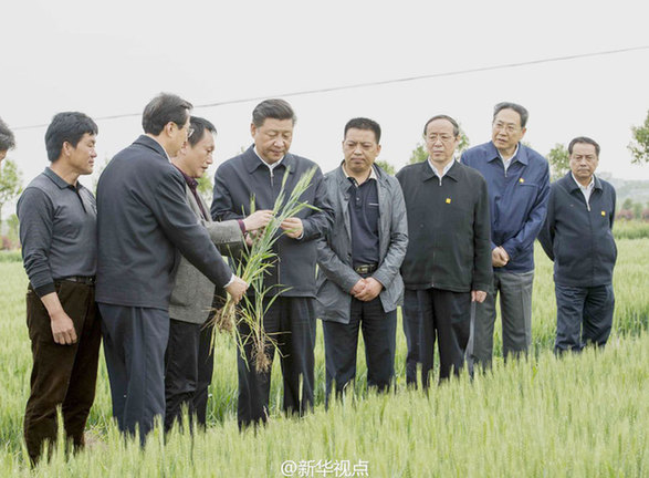 ????25日下午,習(xí)近平來(lái)到小崗村4300畝高標(biāo)準(zhǔn)農(nóng)田示范點(diǎn),沿著田埂走進(jìn)麥田,察看小麥長(zhǎng)勢(shì),向村干部、種糧大戶和農(nóng)技人員了解土地流轉(zhuǎn)、農(nóng)田整理、種植品種、畝產(chǎn)量、病蟲(chóng)害防治、糧食收購(gòu)等情況。聽(tīng)了大家介紹情況,總書(shū)記說(shuō),現(xiàn)在正值抽穗灌漿的關(guān)鍵時(shí)期,要加強(qiáng)田間管理,實(shí)現(xiàn)豐收,今年的白饃能吃到嘴里了。