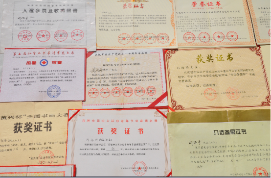 ????文革中,因?yàn)椤爸粚2患t”,劉紹雨失去了考學(xué)機(jī)會(huì),回到生產(chǎn)隊(duì)務(wù)農(nóng)。在生產(chǎn)隊(duì)他挑過(guò)三年大糞,喂過(guò)五年牲口,又在磨粉房里鉆了八年。為了生活他還從事編織、木工、鐵業(yè)、泥巴匠。他相信:天將降大任于斯人也,必先苦其心志,勞其筋骨。在艱苦的歲月里,從沒(méi)間斷過(guò)毛筆字的練習(xí):夜間一個(gè)泥巴臺(tái)上,他點(diǎn)一盞煤油燈,在一張廢紙上,反復(fù)書寫,由白變黑,再蘸水書寫;睡覺(jué)時(shí),想起哪個(gè)字運(yùn)筆妙,他就在被窩里反復(fù)運(yùn)筆。