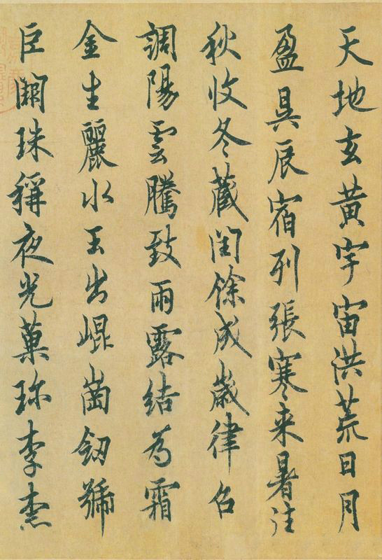 ????《千字文》全書(shū)共250句。每四字一句,四句一組,兩組一韻,前后貫通,互不重復(fù)。其內(nèi)容涉及天文、地理、歷史、農(nóng)工、園藝、飲食起居、修身養(yǎng)性及封建綱常禮教等各個(gè)方面。包羅萬(wàn)象,涵蓋面廣泛,其最大優(yōu)點(diǎn)又在于融知識(shí)性、可讀性和教化性為一爐,誦讀一遍即感到文采斐然,合轍押韻,瑯瑯上口,易誦易記,梁武帝讀后,龍顏大悅,興奮不已。立即命令刻印,作為“諸王”的習(xí)誦課本,并刊諸于世,為初學(xué)者入門(mén)教本。從此,不僅中國(guó)帝王之家有了一本集識(shí)字、書(shū)法和思想內(nèi)容為一體的啟蒙讀物,而且中國(guó)社會(huì)乃至世界教育史上也有了問(wèn)世最早、流傳最久、影響最大的蒙學(xué)教材。