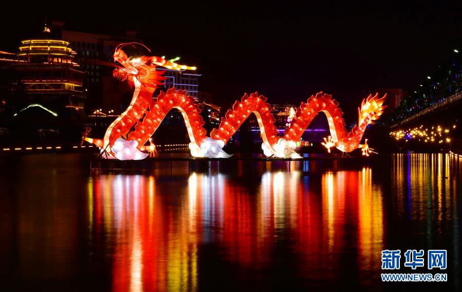 ????這是2月7日在湖北省宣恩縣貢水河畔拍攝的“龍戲水”造型彩燈。