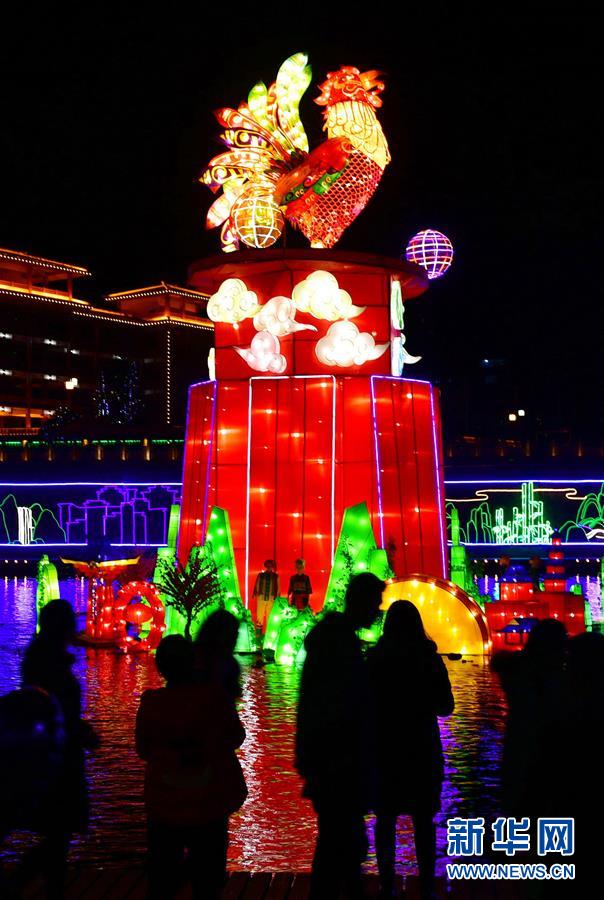 ????2月7日,人們在湖北省宣恩縣貢水河畔觀看彩燈“金雞報曉”。