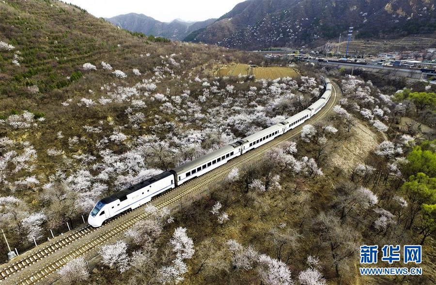 ????一列火車在北京居庸關(guān)附近的山花中穿行(2016年3月28日攝)。 新華社記者鞠煥宗 攝