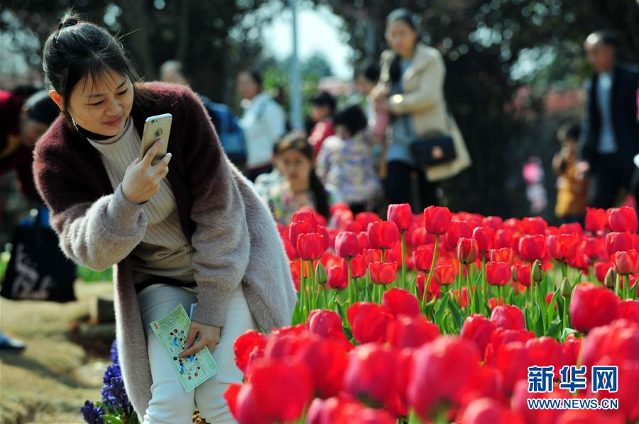 ????3月9日,在南昌縣鳳凰溝景區(qū)內(nèi),游客在花海中觀賞游玩。隨著氣溫日漸回暖,江西省南昌市南昌縣鳳凰溝景區(qū)郁金香、玉蘭花等進(jìn)入花期,景區(qū)步道兩旁群芳吐艷,吸引大批游客前往觀賞游玩,與春天合影。 新華社記者 彭昭之 攝