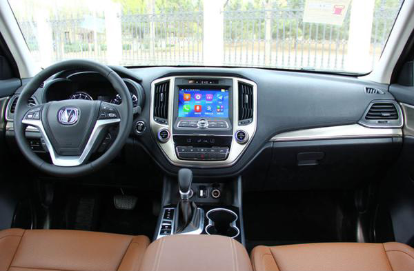 長安CS95采用大尺寸顯示屏搭配實體按鍵,兩側(cè)豎向設(shè)置了空調(diào)出風口,按鍵排布層次分明,但略顯繁雜。新車還配有三輻式多功能方向盤,門板以及換擋桿處增加了木紋裝飾,同時提供5座和7座兩種選擇。