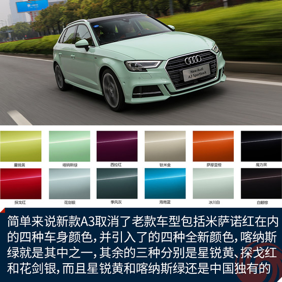 先來說說喀納斯綠到底是什么顏色吧。簡單來說新款A(yù)3取消了老款車型包括米薩諾紅在內(nèi)的四種車身顏色,并引入了的四種全新顏色,喀納斯綠就是其中之一,其余的三種分別是星銳黃、探戈紅和花劍銀,而且星銳黃和喀納斯綠還是兩種中國市場獨(dú)有的顏色。如果說這個(gè)顏色看上去像什么,我覺得大概像是哈密瓜冰激凌,或者是綠色的奶油,反正給我一種清新又甜蜜的錯(cuò)覺。