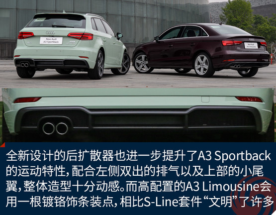 全新設(shè)計(jì)的后擴(kuò)散器也進(jìn)一步提升了A3 Sportback的運(yùn)動(dòng)特性,配合左側(cè)雙出的排氣以及上部的小尾翼,整體造型十分動(dòng)感。而高配置的A3 Limousine會(huì)用一根鍍鉻飾條裝點(diǎn),相比S-Line套件“文明”了許多。與LED矩陣大燈相呼應(yīng)的是全LED尾燈,兩者相輔相成為新車帶來了更強(qiáng)的攻擊性以及橫向視覺延展性,新加入的流動(dòng)式轉(zhuǎn)向燈在美觀的同時(shí)也提升了整車的科技感。