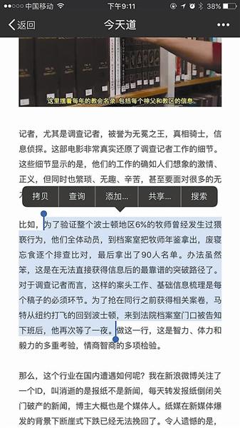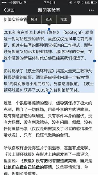 ????昨天,一名賓夕法尼亞大學(xué)的博士生在其微信公眾號上發(fā)文稱,自己2016年1月發(fā)在“新聞實驗室”的公號文章與河北傳媒學(xué)院徐文靜老師在2016年6月發(fā)表的學(xué)術(shù)論文雷同。北青報記者調(diào)查發(fā)現(xiàn),被舉報雷同的論文的22個段落中,與“新聞實驗室”的文章雷同的有18段,另有4個段落分別與新浪娛樂的一篇電影評論以及微信公眾號“今天道”的一篇文章的相應(yīng)章節(jié)雷同。昨天下午,河北傳媒學(xué)院宣傳部的工作人員告訴北青報記者,學(xué)校相關(guān)領(lǐng)導(dǎo)已經(jīng)找徐文靜進行了談話,并第一時間展開調(diào)查,最終會查實情況做出處理意見。 ???? ????微信公號《今天道》原文 ????傳媒老師論文被指照抄 ????昨天上午,微信公眾號“新聞實驗室”發(fā)布了一篇公告,公告的作者是一名賓夕法尼亞大學(xué)的博士生,他表示自己近日發(fā)現(xiàn),河北傳媒學(xué)院一名叫徐文靜的老師于學(xué)術(shù)刊物《青年文學(xué)家》2016年第17期上發(fā)布了一篇標題為《從電影<聚焦>看記者的采訪技巧》的文章,內(nèi)容與他2016年1月發(fā)布的《獲普利策獎的調(diào)查報道是怎么做的?這部電影就是一本教科書》的文字多處雷同。“幾乎是我此前發(fā)布的文章的翻版,只是刪除了少許段落而已?!?/p> ????《青年文學(xué)家》雜志的版權(quán)信息顯示,該雜志為旬刊,2016年第17期在當年6月份出版。北青報記者獲取了涉事論文,徐文靜是這篇論文的唯一署名作者。作者簡介中介紹,生于1980年的徐文靜為河北衡水人,碩士,目前是河北傳媒學(xué)院講師,研究方向為新聞實務(wù)和媒介融合。 ????北青報記者比較了徐文靜的《從電影<聚焦>看記者的采訪技巧》和“新聞實驗室”的《獲普利策獎的調(diào)查報道是怎么做的?這部電影就是一本教科書》,發(fā)現(xiàn)兩篇文章確有大量雷同。 ????“新聞實驗室”原文共有“團隊合作”、“完善的資料庫”、“不停地采訪,不停地看資料”、“線人”、“采訪技巧”、“利用法律”、“旁觀者視角”、“報社的投入”8個小標題。而徐文靜文章的小標題依次為“團隊合作”、“完善的資料庫”、“線人的重要性”、“采訪技巧”、“報社的投入”,共5個小標題。 ????小標題下的內(nèi)容也高度雷同,除去小標題,徐文靜的論文全文共有22個自然段,其中18個自然段與“新聞實驗室”雷同。絕大多數(shù)段落文字完全一致,區(qū)別之處主要是一些字詞、標點的調(diào)整,如“新聞實驗室”原文中寫道:“記者也不是孤膽英雄——他/她的背后還有編輯?!毙煳撵o論文中相應(yīng)的話是:“記者也不是孤膽英雄,他的背后還有編輯?!?/p> ??? ????被指抄襲的論文 ????涉事論文由三篇文章“構(gòu)成” ????北青報記者調(diào)查發(fā)現(xiàn),徐文靜論文的22個自然段中,除了18個自然段和“新聞實驗室”2016年1月發(fā)布的文章雷同外,另外4個自然段,也可以在網(wǎng)上找到出處。 ????在小標題“采訪技巧”下的內(nèi)容中,論文用3個自然段講述了影片中兩名演員的一段“交叉采訪戲”,這段內(nèi)容出現(xiàn)在新浪娛樂2015年9月發(fā)布的一篇影評文章中。 ????2015年9月,電影《聚焦》在威尼斯電影節(jié)舉行首映式,第二天一名新浪娛樂深度策劃編輯發(fā)表了一篇題為《<聚焦>:一曲唱給傳統(tǒng)媒體記者的贊歌》,文中記述了影片中的那段“交叉采訪戲”。北青報記者對比發(fā)現(xiàn),徐文靜論文中的3個自然段與《<聚焦>:一曲唱給傳統(tǒng)媒體記者的贊歌》中的相應(yīng)段落幾乎一字不差。 ????昨天下午,《<聚焦>:一曲唱給傳統(tǒng)媒體記者的贊歌》的作者在接受北青報記者采訪時表示,該文章是其為電影《聚焦》首映式撰寫的影評,首映式第二天便在新浪娛樂網(wǎng)站上發(fā)布。作者對北青報記者表示:“文章是我獨立撰寫的,我并不認識徐文靜這個人,她沒有參與到這篇文章的寫作,我們也沒有給她任何授權(quán)。” ???? ????微信公號《新聞實驗室》原文