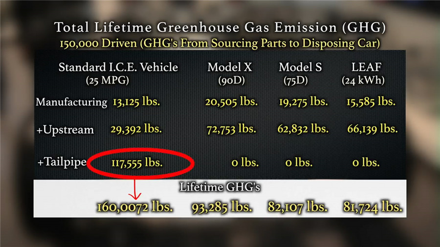 ????????這張表更加清晰,分別統(tǒng)計了普通內(nèi)燃機(jī)汽車(25MPG=百公里油耗9.4升)、特斯拉Model X 90D、Model S 75D和聆風(fēng)(電池容量24kWh)在車輛生產(chǎn),燃油/電能生產(chǎn)過程以及駕駛使用過程中的排放,可以看到,盡管電動車在車輛生產(chǎn)、電能生產(chǎn)過程中產(chǎn)生的排放更高,但行駛工程中的零排放仍然使其在整個生命周期中的排放更低。