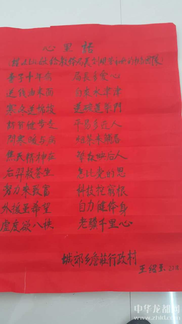 “我推敲了幾個(gè)半夜,寫(xiě)了《心里話——謹(jǐn)以此獻(xiàn)給教體局局長(zhǎng)劉現(xiàn)營(yíng)和他的扶貧團(tuán)隊(duì)》這首五言排律,表表我和老伴及全村對(duì)您的感激之情?!薄捌拮邮瓴。珠L(zhǎng)多愛(ài)心。送錢(qián)米油面,自來(lái)水津津。寒冬送棉被,送炭至柴門(mén)。訪貧健步走,平易又近人?!蓖踅B玉聲情并茂地朗讀著,劉局長(zhǎng)爽朗地笑了,“老伴劉桂蘭藥按時(shí)吃了嗎?”“按時(shí)吃了,多虧您,到我家宣講扶貧政策,幫助我聯(lián)系有關(guān)單位,我老伴享受了慢性病醫(yī)保?!薄肮鹛m說(shuō),人家劉局長(zhǎng)隔三差五給咱送米面油,逢年過(guò)節(jié)給咱送慰問(wèn)金,前幾天頂風(fēng)冒雪送來(lái)兩床被子,一年不知來(lái)了多少趟,待咱比親人還親?。∥壹乙矝](méi)有什么拿出手的,我倆一合計(jì),就發(fā)揮我的一點(diǎn)專長(zhǎng),給您寫(xiě)了首詩(shī),您經(jīng)常去我家噓寒問(wèn)暖,我今個(gè)也來(lái)您這,算是走走親戚吧,回報(bào)回報(bào)您!”