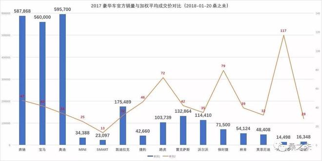 銷售的數(shù)量固然重要,但是銷售質(zhì)量也是評(píng)估銷售力不能忽視的重要指標(biāo)。衡量銷售質(zhì)量,“加權(quán)平均成交價(jià)”和“單車?yán)麧?rùn)”這兩個(gè)重要參數(shù),也許讓我們更直觀的看到車企的銷售能力與經(jīng)銷商單店經(jīng)營(yíng)質(zhì)量。這些更微觀的數(shù)據(jù)往往更能反映銷售公司及其經(jīng)銷商體系的銷售能力及水平?!凹訖?quán)平均成交價(jià)”反映車企的產(chǎn)品力與銷售公司的銷售能力,車企賣掉的車越多,單車價(jià)格越貴,品牌就越具有競(jìng)爭(zhēng)力,反之就需要考慮改進(jìn)產(chǎn)品,提升銷售管理能力?!皢诬?yán)麧?rùn)”指經(jīng)銷商銷售新車獲取的利潤(rùn),不含衍生利潤(rùn),一般在-4%-7%之間,如果單車?yán)麧?rùn)超過(guò)-2%,廠家需要考慮對(duì)經(jīng)銷商進(jìn)行補(bǔ)貼,如果利潤(rùn)超過(guò)7%,車企就會(huì)調(diào)整經(jīng)銷商浮動(dòng)返利。下面我們通過(guò)這兩個(gè)指標(biāo),來(lái)看哪些豪華車品牌在2017年表現(xiàn)更具實(shí)力。