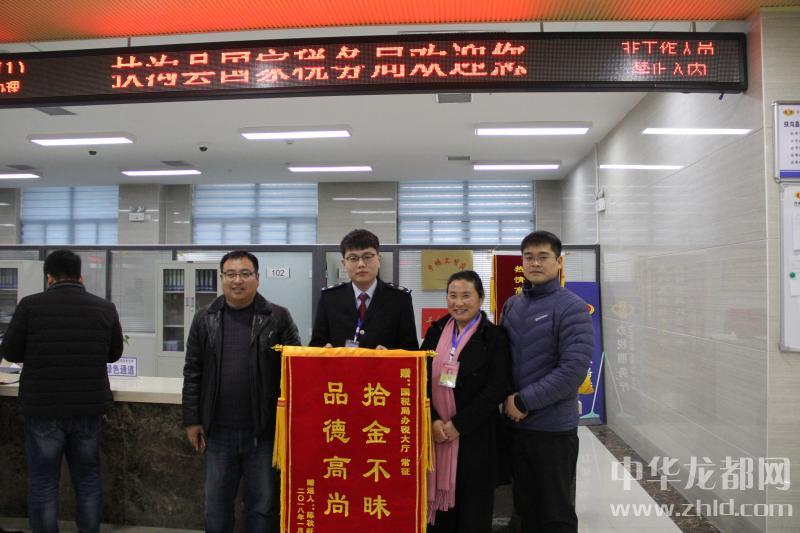 中華龍都網訊(周口報業(yè)全媒體記者 謝永靜)1月22日剛剛上班,陳秋旺和同事手拿“拾金不昧品德高尚”的錦旗來到扶溝縣國稅局辦稅服務廳,專程向拾金不昧的工作人員常征致謝。