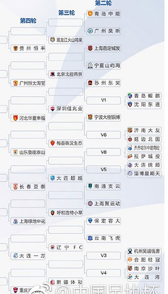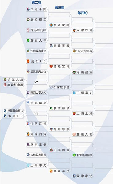 第四輪開始16支中超球隊(duì)加入角逐,加上從第三輪晉級(jí)的16支球隊(duì),共32支球隊(duì)參賽,中超球隊(duì)自動(dòng)落位相應(yīng)客場(chǎng)簽位,其中廣州恒大、上海申花、上海上港和天津權(quán)健4支亞冠球隊(duì)將分別落位在A、B、C、D區(qū),這4支球隊(duì)在半決賽之前不會(huì)相遇。