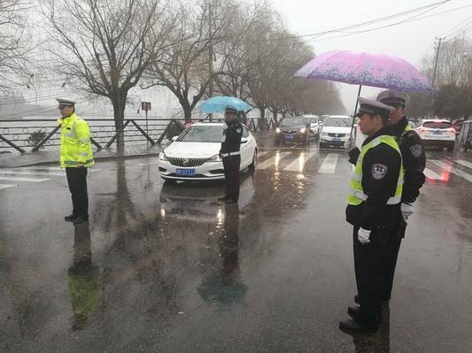 按照會(huì)議的統(tǒng)一安排部署,交警大隊(duì)城市中隊(duì)負(fù)責(zé)羲皇賓館門前、老看守所路口和商城東路的道路保障工作。執(zhí)勤民警合理分配警力,清理引導(dǎo)路面亂停亂放車輛,合理分流駛?cè)胲囕v,規(guī)范指揮路口交通,他們克服寒冷下雨惡劣天氣,充分發(fā)揚(yáng)不怕苦不怕累的精神。在雨中一刻不停的忙碌著,中隊(duì)長(zhǎng)閆本志的微信運(yùn)動(dòng)的步數(shù)達(dá)到30000多步,成功登頂榜首,交警隊(duì)員李炯等帽子淋濕了,衣服淋濕了,鞋子也進(jìn)水了,他們顧不了這些,一絲不茍的工作。他們的辛苦付出感動(dòng)了過(guò)往司機(jī)和行人,一位女士下車送來(lái)雨傘,被執(zhí)勤交警婉拒了,后邊的過(guò)路行人直接打開(kāi)車窗為過(guò)交警扔下雨傘而去。一會(huì)功夫,執(zhí)勤的路口多了各種色彩的花雨傘,在雨中游走,像綻放的太陽(yáng)花,裝扮了雨中的淮陽(yáng)。