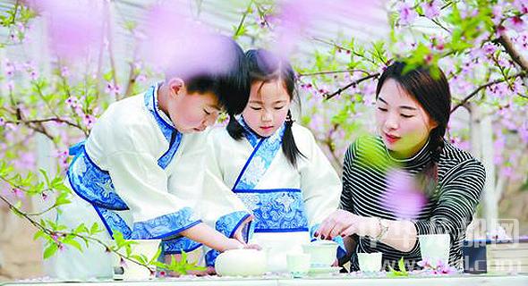日前,一位年輕的媽媽帶著一雙兒女在扶溝縣韭園鎮(zhèn)的一個(gè)溫室大棚基地學(xué)習(xí)茶藝。據(jù)悉,該基地共有11個(gè)桃樹溫室大棚和200畝露地桃林。在近1個(gè)月的花期里,該基地免費(fèi)向游客開放。前來賞花的游客不但可以在花間彈古箏、拍照,也可以學(xué)習(xí)茶藝,既欣賞了美景,又陶冶了情操。谷志方 李永超 攝