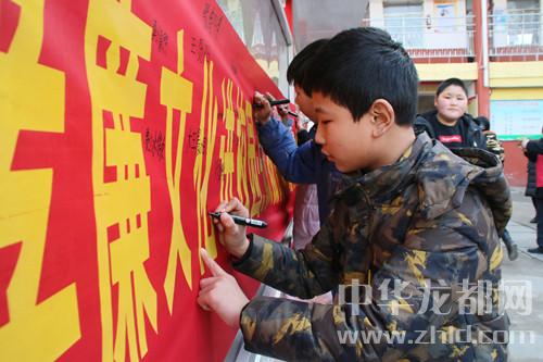 中華龍都網(wǎng)訊(周口報業(yè)全媒體記者 韋偉 通訊員 王佳佳 辛曼 攝)今年是毛澤東“向雷鋒同志學(xué)習(xí)”題詞55周年。3月5月,沈丘縣紀委監(jiān)委聯(lián)合縣義工聯(lián)走進沈丘二高、河南小學(xué),開展“孝廉文化進校園”活動,旨在弘揚雷鋒精神和“孝善儉廉”的美德。圖為:學(xué)生們在“弘揚雷鋒精神,做‘孝善儉廉’美德少年”條幅前簽字。