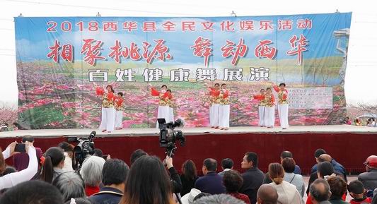 中華龍都網(wǎng)訊(周口報業(yè)全媒體記者 張猛)在西華縣第十四屆桃花節(jié)期間,由縣委宣傳部、縣文廣新局主辦的“相聚桃源 舞動西華”百姓健康舞展演活動,在黃橋鄉(xiāng)萬畝桃園舉行,來自全縣的10 余支舞蹈隊參加展演?;顒游姸嗍忻瘛⒂慰颓皝碛^看。