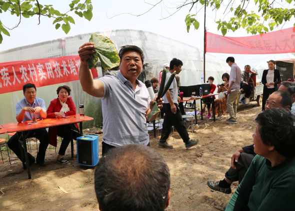 5月10日,在鹿邑縣馬鋪鎮(zhèn)完樓村殘疾人士付天軍的培訓基地——蔬菜種植合作社助殘大棚內,來自鹿邑縣馬鋪鎮(zhèn)、渦北鎮(zhèn)產業(yè)集聚區(qū)的150多名建檔立卡貧困殘疾人,齊聚這里免費學習黃瓜種植技術,付天軍在大棚內手把手地進行指導,來自華陽學校的農業(yè)專家李中蘭也應邀在大棚內對常見的病蟲害進行詳細講解。