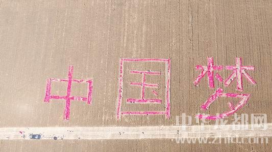 記者在現(xiàn)場看到,“中國夢”三個字每個字高約30米,寬約23米,間隔約10米,筆畫寬約2米。為了讓字跡突出,他們把以前懸掛宣傳標語的廢棄紅布條,鋪在麥茬上。一片金黃中,紅艷的字體格外奪目。