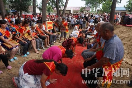 儀式上宣布了對前何行政村31戶孝老愛親之家進(jìn)行表彰的決定,并為他們頒發(fā)了“馬廠鎮(zhèn)孝老愛親之家”牌匾。在《愛的奉獻(xiàn)》樂曲伴奏下,31個(gè)孝老愛親之家的孝順兒子、孝順兒媳婦向自己的父母行跪拜之禮。