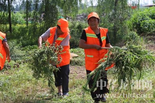 “蒿草長得比人都高,拔都拔不掉,鐮刀都割斷了好幾把了,只能徒手拔。”附近村民姜翠英對(duì)記者說,她和同伴們從早上5點(diǎn)多就開始在這兒除草了,雖然又熱又累,但能為城市美化做點(diǎn)貢獻(xiàn)也很高興。