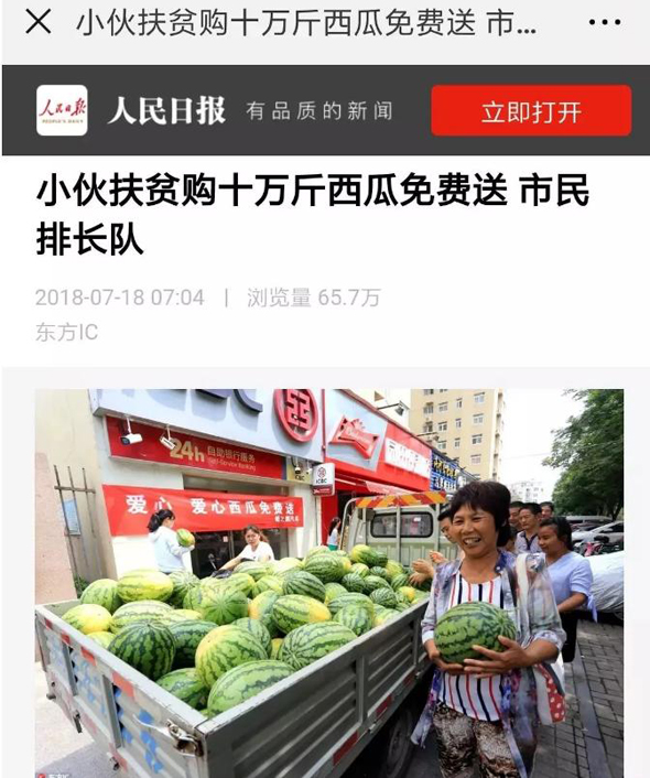 7月18日,《人民日報》客戶端播發(fā)了“小伙購十萬斤西瓜免費送 市民排長隊”的一條新聞,瞬間刷屏朋友圈,一天閱讀量就突破100萬人次,加上騰訊新聞、人民圖片截至19日發(fā)稿時閱讀量已達(dá)一百五十萬人次,評論13000多條,人們都在稱贊咱扶溝小伙宋鐵托的善舉,被網(wǎng)友稱他為“愛心西瓜哥”。