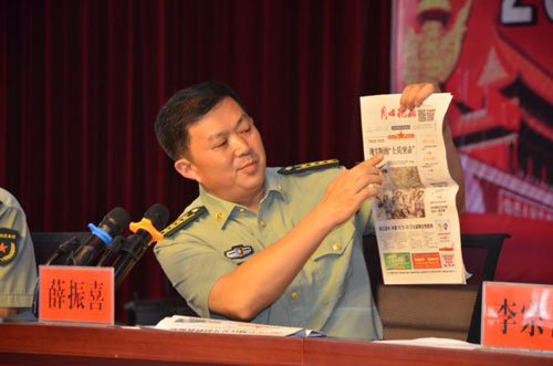 在當(dāng)天的動(dòng)員會(huì)上,薛振喜副司令員手持《周口晚報(bào)》說(shuō),報(bào)紙上刊登的“周口好兵”系列報(bào)道,每一篇都是一個(gè)榜樣,每一篇都是一種激勵(lì),希望在座的預(yù)征青年們到部隊(duì)后咬牙堅(jiān)持、刻苦錘煉,打響周口好兵品牌,家鄉(xiāng)父老等著你們?cè)缌⑿鹿Φ南灿崱?/p>
