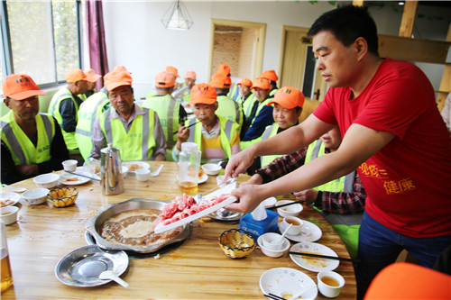 姜玉伸是承擔(dān)鳴鹿路北段保潔任務(wù)的一名老環(huán)衛(wèi)人,他告訴記者:“從今天夏天開始,該店就在店里設(shè)置了環(huán)衛(wèi)工人免費(fèi)休息飲水點(diǎn),有時(shí)候工作量大的時(shí)候,中午回不了家,店老板就讓我們在飯店免費(fèi)就餐。今天,該店又準(zhǔn)備了免費(fèi)火鍋,讓我們提前過重陽節(jié),我們感覺心里暖暖的?!?/p>