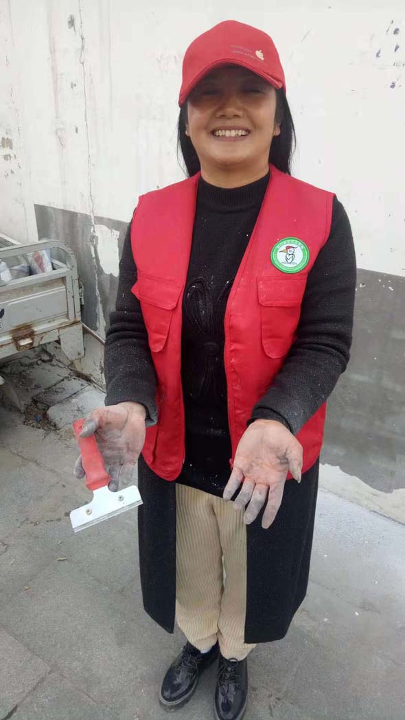 周口市啄木鳥志愿者服務(wù)工作委員會(huì)臨時(shí)黨支部書記、周口市慈孝文化促進(jìn)會(huì)會(huì)長(zhǎng)孫彩云更是不怕臟,不怕累,連個(gè)手套都不帶,直接用雙手拿著鏟刀或者抹布清理墻上的小廣告,最后弄得雙手和滿身都是污漬。“為了我們的城市更漂亮,作為一名志愿者,就應(yīng)該不怕累,不怕苦。”