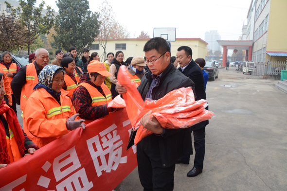 近日寒流來襲,氣溫驟降,連續(xù)的低溫降雨天氣讓人感受到了冬天的寒冷,為了確??h城區(qū)環(huán)境衛(wèi)生干凈整潔,廣大環(huán)衛(wèi)工人們始終堅持冒嚴寒每天起早貪黑打掃城區(qū)衛(wèi)生,默默無聞堅守在工作一線。12月3日,西華縣媧城商會會長黃鳳芝攜手愛心企業(yè)山西汾酒集團代理商宋二領來到城管局向環(huán)衛(wèi)工人捐贈一批環(huán)衛(wèi)保潔防寒服,在寒冷冬天為堅守縣城區(qū)保潔一線的每位環(huán)衛(wèi)工人送去溫暖。