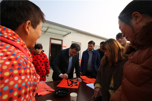 李宗喜一邊寫春聯(lián),一邊詢問居民生活情況。冬天住這兒冷不冷?超市里的東西貴不貴?住在這里安全不安全?他問得很細。劉愛菊、朱桂英、王芬、李會等住戶,你一言我一語,紛紛說出自己的感受:“冬天有空調(diào),不冷!”“超市里的東西跟外面一樣便宜!”“小區(qū)有監(jiān)控和保安,住在這里很安全。”有的甚至幽默地說:“我在這里都住習慣了,感覺挺好,以后就不搬走了!”聽到這話,眾人都笑了起來。