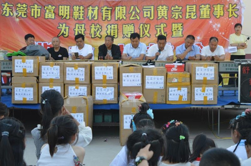 當(dāng)日下午,廣東東莞富明鞋材有限公司董事長黃宗昆為母校薛廟小學(xué)師生捐贈愛心運(yùn)動鞋儀式在馬頭鎮(zhèn)薛廟小學(xué)舉行。馬頭鎮(zhèn)中心校副校長李永長、中心校辦公室主任章紅勝、薛廟行政村黨支部書記黃志華等村兩委領(lǐng)導(dǎo)、校長黃景思、名譽(yù)校長孫道紅、全校260 多名師生及部分學(xué)生家長600多人參加了當(dāng)天的捐贈儀式。