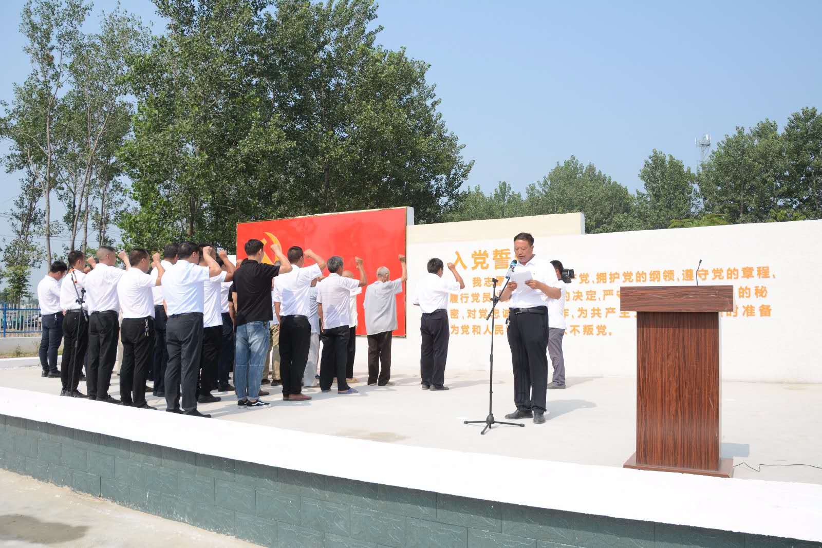 “我志愿加入中國共產黨,擁護黨的綱領,遵守黨的章程……”升國旗儀式結束后,由紀莊支部書記李國喜領誓,全體黨員面對鮮紅黨旗,胸前佩戴黨徽,排著整齊的隊列,高高舉起右手,再次向黨作出了莊嚴地承諾,重溫入黨誓言,聲聲入耳,句句入心。