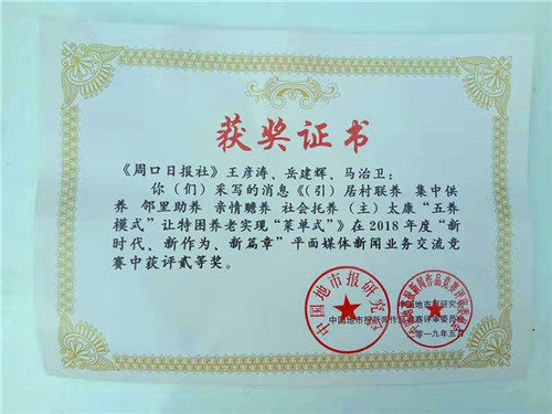 河南新聞獎是河南省新聞界最高獎。日前,經(jīng)過初評、復(fù)評、定評、公示等一系列環(huán)節(jié)后,《周口日報》二版頭題刊發(fā)的《太康“五養(yǎng)模式”讓特困養(yǎng)老實現(xiàn)“菜單式”》(作者:王彥濤 岳建輝 馬治衛(wèi) 編輯:魏東 李鳳霞)喜獲河南新聞獎一等獎,成為周口市唯一獲得一等獎的新聞作品。同時,《太康“五養(yǎng)模式”讓特困養(yǎng)老實現(xiàn)“菜單式”》還榮獲了中國地市報新聞獎二等獎,可謂“雙喜臨門”。