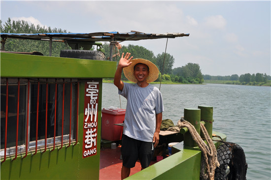 8月8日上午,在碧波蕩漾的商水港區(qū),6條載重上千噸的大船緊靠在一起,一船金燦燦的玉米,兩船褐色的石子,三船白色晶體方解石。站在港口上方遠(yuǎn)遠(yuǎn)望去,6條貨船像一塊彩條布鑲嵌在綠色的河面上。