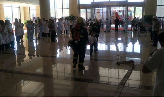 此次演練模擬一個蒙面歹徒在該縣六樓某科室打砸并故意縱火,轄區(qū)公安干警、消防指戰(zhàn)員及醫(yī)院保安力量迅速出動處置,防恐人員及時將犯罪分子制服,而此時醫(yī)院內(nèi)火災(zāi)迅速蔓延,多名醫(yī)護人員被困火場無法逃生,醫(yī)院負責人通過應(yīng)急廣播進行人員疏散,消防指戰(zhàn)員按照預(yù)定應(yīng)急處置方案迅速展開滅火救援行動。