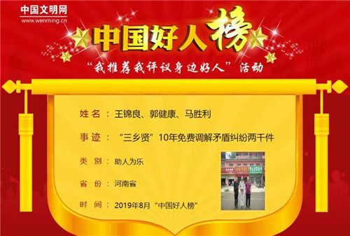 太康縣王錦良、郭健康、馬勝利在楊廟鄉(xiāng)成立幸福調(diào)解室,10年調(diào)解矛盾兩千件,成為各界美談。9月2日,8月份中國好人榜發(fā)布,該縣楊廟鄉(xiāng)幸福調(diào)解室“三鄉(xiāng)賢”同時(shí)榮登中國好人榜。截至目前,該縣入選“中國好人榜”已達(dá)60人。