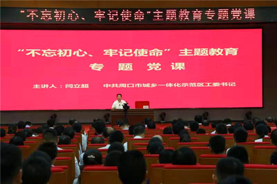 會上,閆立超根據“不忘初心,牢記使命”主題教育的要求并結合示范區(qū)的實際,從四個方面進行了深入淺出地講解。一“不忘初心,牢記使命”是共產黨員永恒的課題。開展“不忘初心,牢記使命”主題教育工作是非常必要的,也是非常重要的,主要體現(xiàn)在它是新時期中國特色社會主義思想武裝全黨的需要、它是新時期黨的建設的需要、它是保持黨和人民群眾血肉聯(lián)系的需要、它還是落實十九大提出的明確目標任務的需要。習近平總書記告誡我們,無論走多遠,都不能忘記來時的路。二“不忘初心,牢記使命”務必做到四個貫徹始終。學習教育要貫徹始終;調查研究要貫徹始終;檢視問題要貫徹始終;問題整改要貫徹始終。三“不忘初心,牢記使命”要知行合一謀發(fā)展。示范區(qū)新一屆黨工委、管委會領導班子成立以來,取得了全市人民有目共睹的成績,概括起來就是“五大突破、一大提升”?!拔宕笸黄啤奔础皟蛇`”治理大突破、棚改征遷大突破、項目建設大突破、財稅收入大突破和城市建設大突破?!耙淮筇嵘奔词痉秴^(qū)各級干部、人民群眾形象大提升。2017、2018連續(xù)兩年被評為全市綜合考評優(yōu)秀等次。四“不忘初心,牢記使命”體現(xiàn)黨的建設高質量。要強化黨的建設,建立、建強各級黨組織;要健全黨的生活;要加強黨員管理;要體現(xiàn)對黨忠誠,對黨忠誠要害在“絕對”兩個字,就是唯一的、徹底的、無條件的、不摻雜任何雜質的、沒有任何水分的忠誠;要樹立黨的形象。共產黨員要敢于擔當,沖鋒在前,退卻在后,勇于作為,在不同的崗位上做出普通、平凡而又偉大的事業(yè)。
