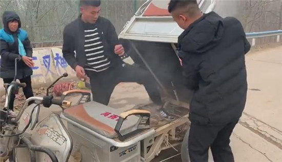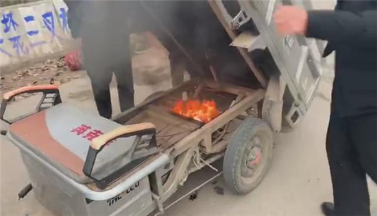 “當(dāng)時在我們前方的一輛電動三輪車駕駛座下冒出黑煙,車上兩位老人察覺到危險后,急忙下車,站在一旁不知所措。我們也緊跟上前。事發(fā)突然,現(xiàn)場沒有滅火器和可利用水源,而三輪車的火越來越大,兩位老人著急萬分,在旁邊不停地請求我們幫幫她們。根據(jù)經(jīng)驗,我們當(dāng)機立斷利用路邊的泥土進(jìn)行撲救,經(jīng)過幾十秒的緊張撲救,著火部位被成功撲滅。”三位消防隊員回憶說三輪車是電線短路引起的電瓶著火。