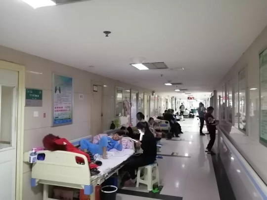 在周口市中心醫(yī)院門診部輸液處,數(shù)排輸液座椅坐滿了輸液的患者,患者中絕大部分是孩子。在周口市中心醫(yī)院住院部11樓兒科A、B兩個病區(qū),每個病房內(nèi)全部住滿患者,病區(qū)走廊已經(jīng)布滿加床,一些病人只能臨時住在加床上。可以看到加床的編號,已經(jīng)排到了50號之后。