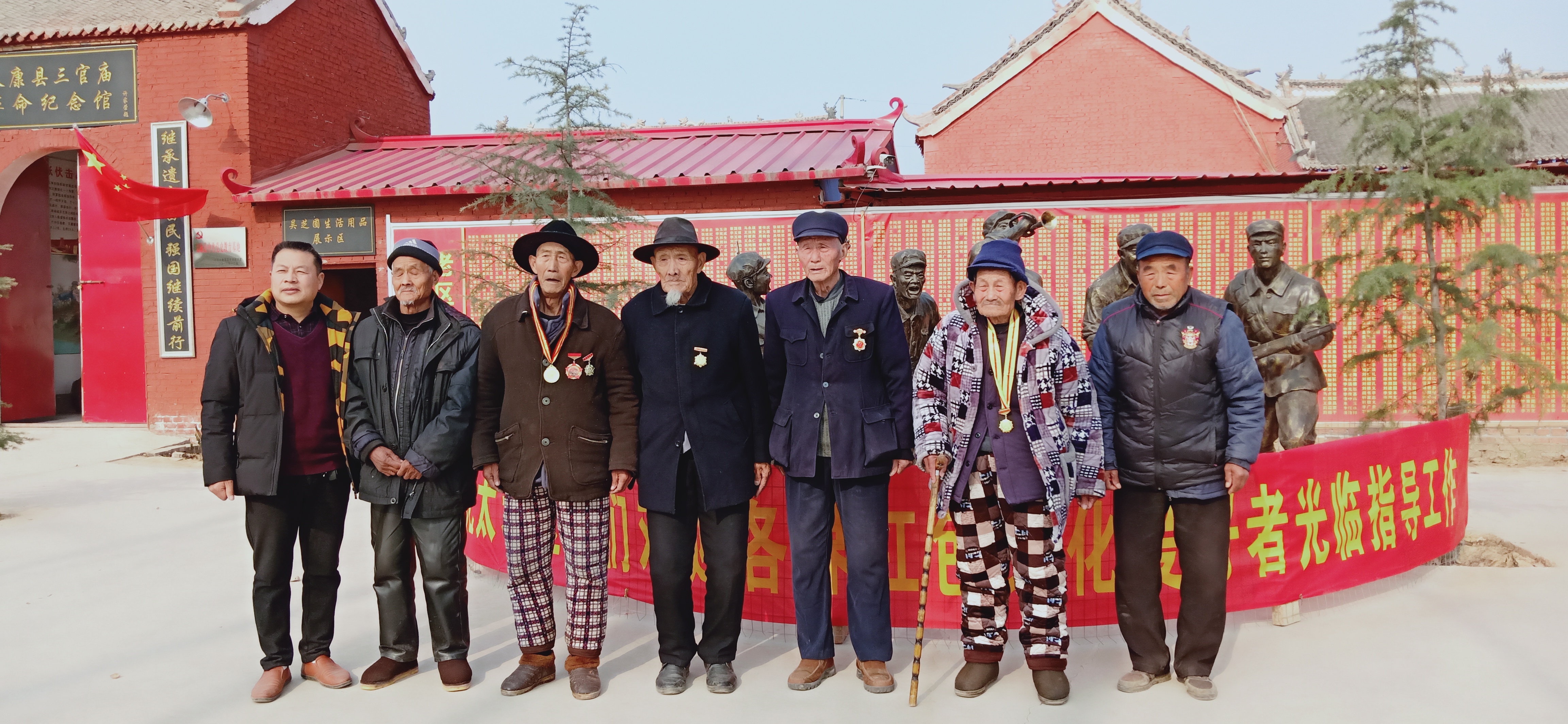 健在老兵在三官?gòu)R革命紀(jì)念館合影留念。